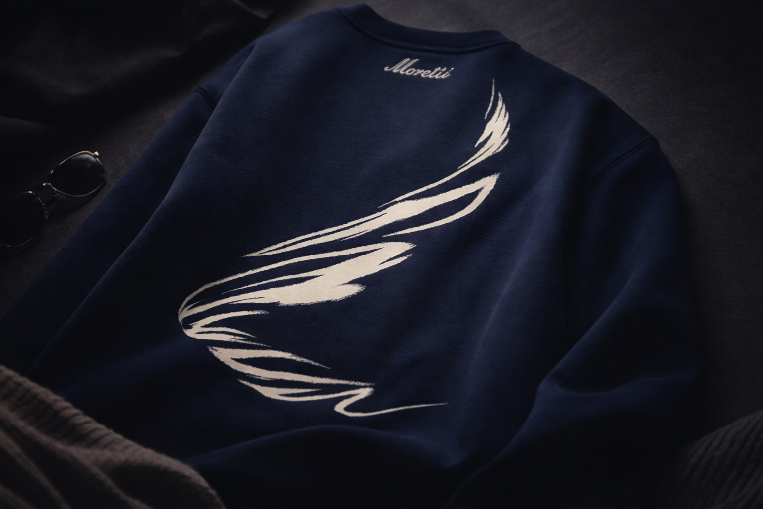 Un sweater que destaca sin gritar. En un tono azul marino profundo, el trazo blanco en la espalda es el sello artísti...